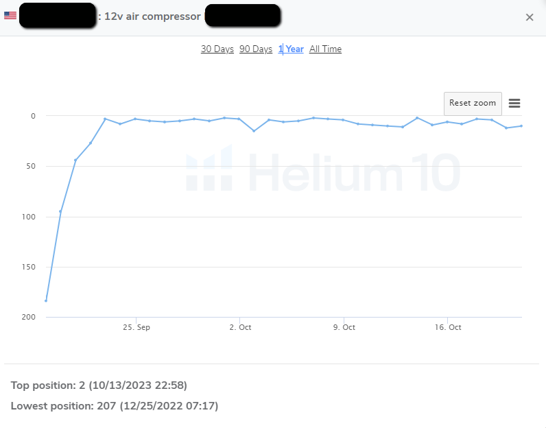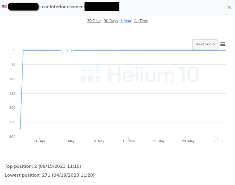 Car Interior Cleaner illustrates the transformation possible for legacy SKUs. Initially ranked 271 on April 19, 2023, the product underwent a content and ranking overhaul. By September 15, 2023, it had reached position 2 and has since remained consistently near the top of search results.