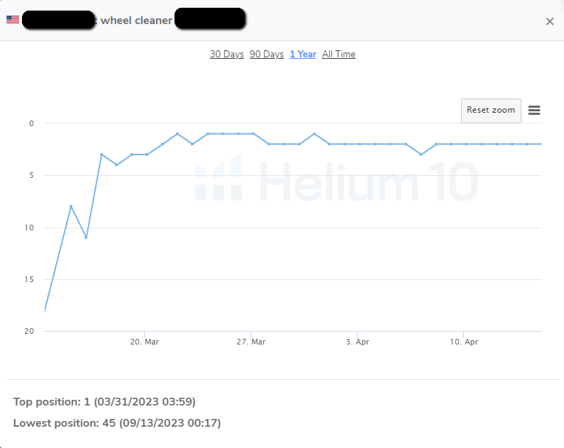 In March 2023, Wheel Cleaner entered the market atat position p 19. Within two weeks it climbed into the Top 5, reaching position 1 on March 31, 2023. The product has since maintained near-top rankings, demonstrating the impact of an aggressive launch campaign supported by keyword-optimized content and ranking acceleration.