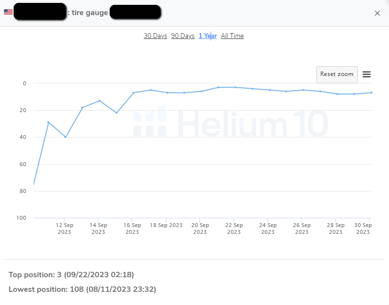 Tire Gauge began in a highly competitive keyword field, ranking as low as 108 on August 11, 2023. Following a visibility and ranking initiative, it surged into the Top 20 within days and reached position 3 on September 22, 2023. Since then, it has consistently held positions in the Top 20, validating the strategy in a crowded market.