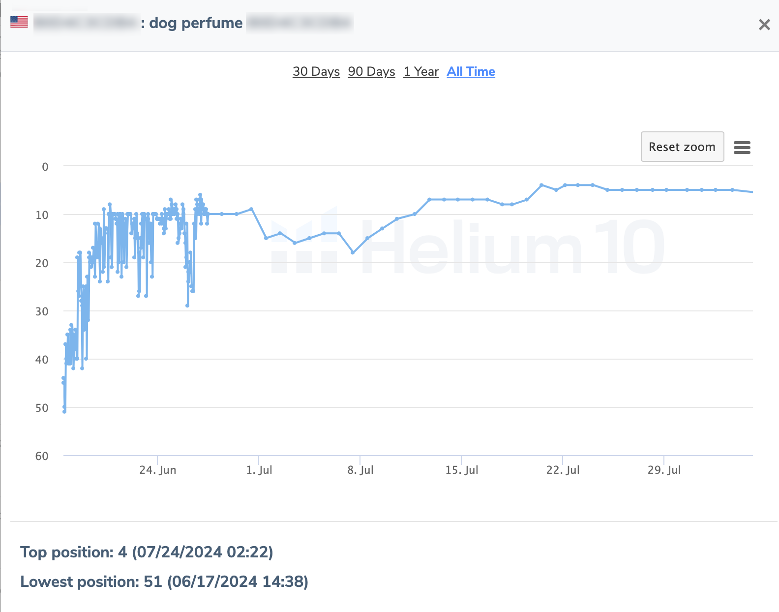 Launched in June 2024, Dog Perfume entered the market at position 51 on June 17. By executing a visibility acceleration campaign supported by keyword-rich content and A+ branding, the product quickly gained traction.