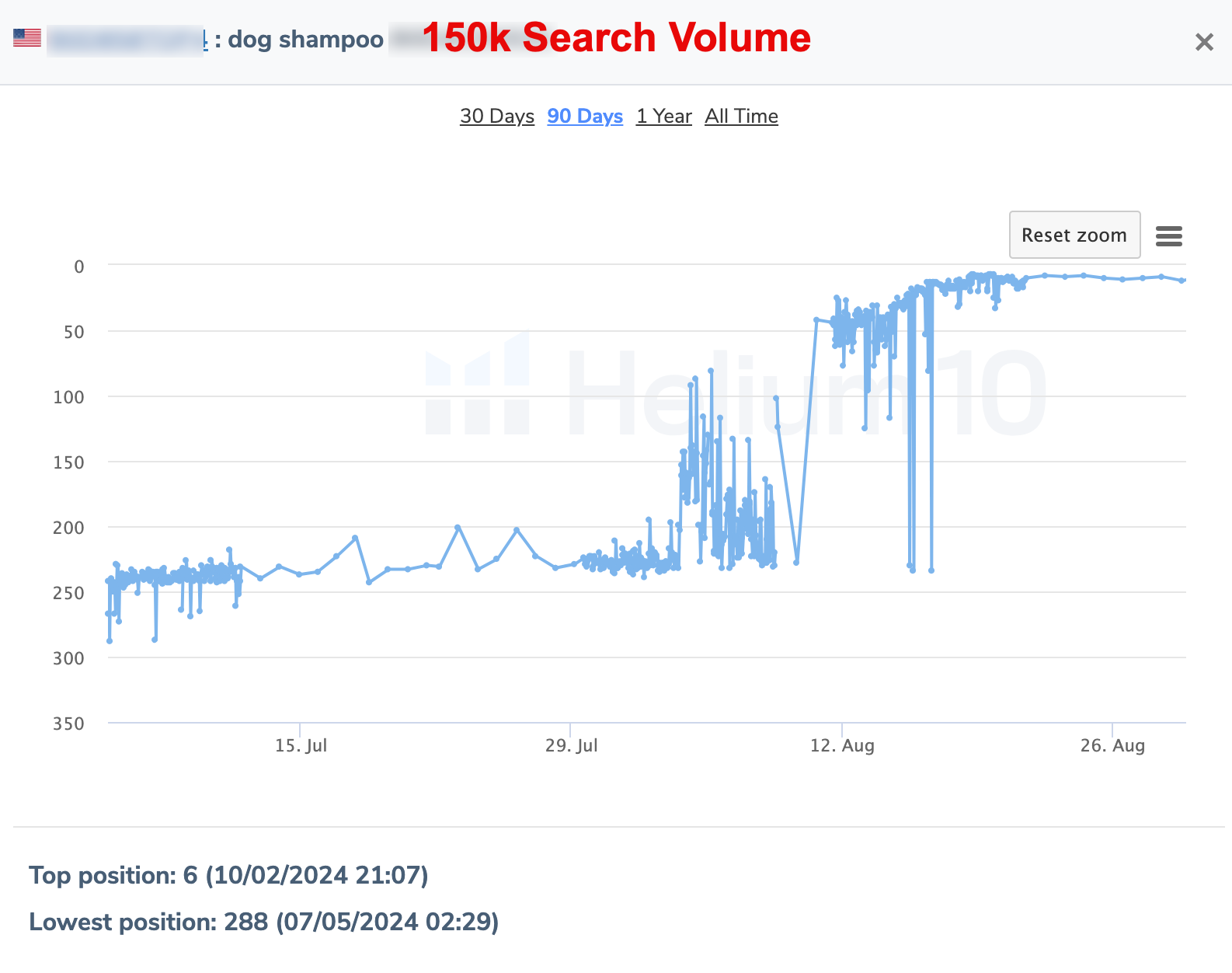 Dog Shampoo faced a tougher challenge. With approximately 150,000 monthly searches, the category is highly competitive. In early July 2024, the product was buried at position 288 (July 5).